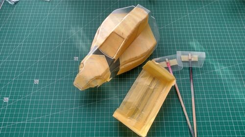 どーも!おーちゃんです。今日からはDT-02のボディ製作です。 再販されてもすぐに売り切れになっちゃうサンドバイパーボディ。運良くゲットできました。 ボディの耳・・・でいいのかな?端の平らな部分を切り落とし、カットラインに線を引きました。 カット…